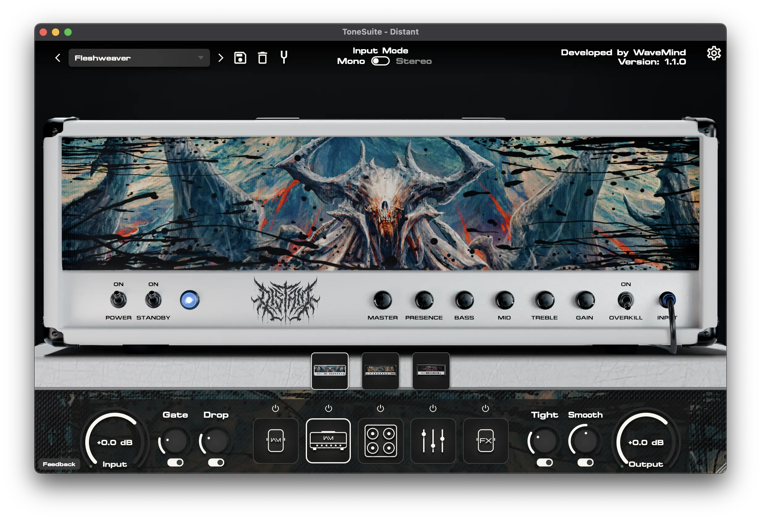 Die ToneSuite enthält eine Sammlung von 3 benutzerdefinierten Verstärkern. Eine Klangpalette, die alle Stile von Hardrock bis Deathcore abdeckt.